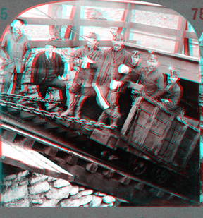 You see here a crowd of miners on a car ready to be lowered into a Pennsylvania coal mine. Inside the shaft, running directly down into the earth, there is a tunnel, or slope, as it is called, leading into the mine. On cats such as the one here shown coal is brought to the surface from far back in the mine. A stationary engine furnishes the power to drag the cars up the steep incline.
