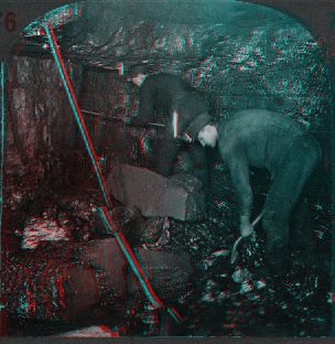 The miner in the background is drilling a hole in the solid layers of anthracite, making ready to put in a blast of powder. The helper is busy shoveling the loose coal into a car which will carry it to the elevator. From there it will be taken to the surface where there is a coal breaker. You will observe that each man has a tin lamp fastened to the front of his cap. What looks like candles sticking up from these lamps are the sheets of flame.