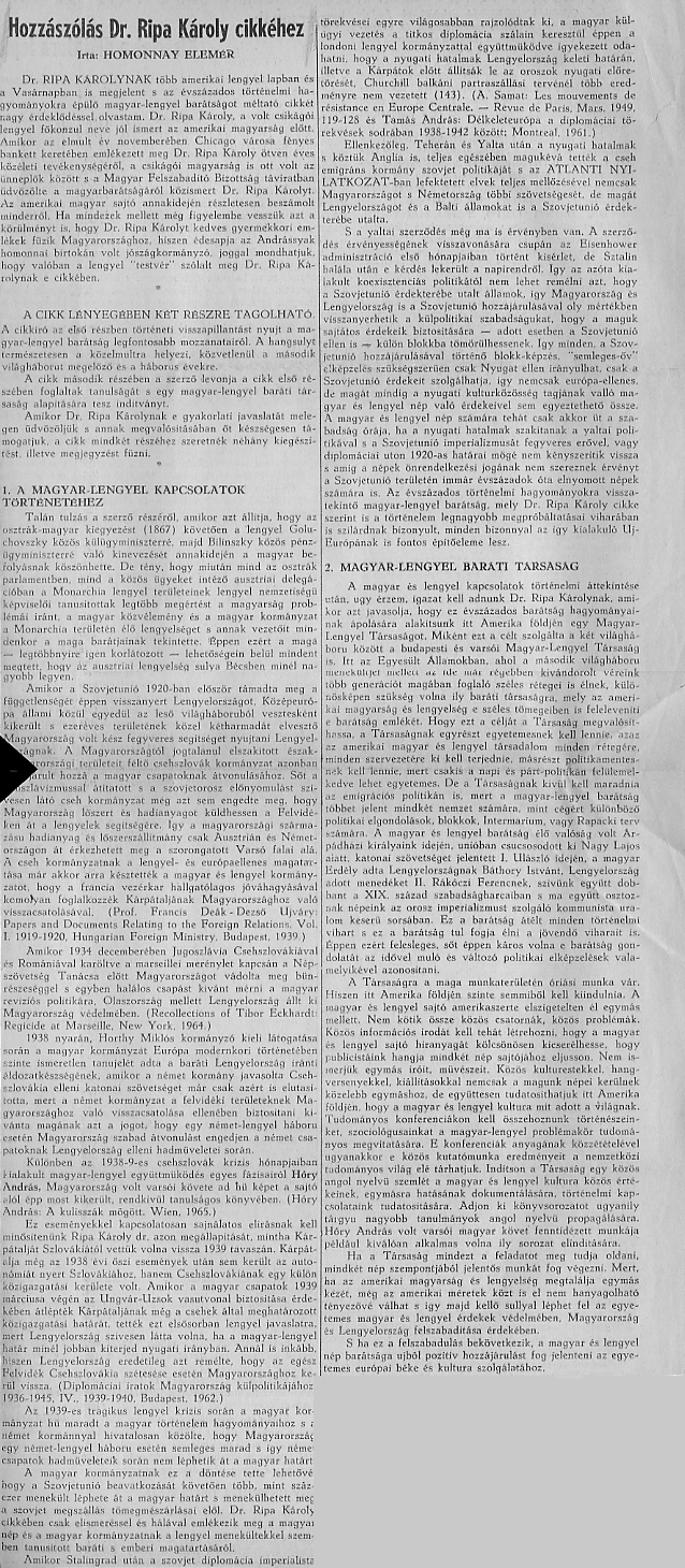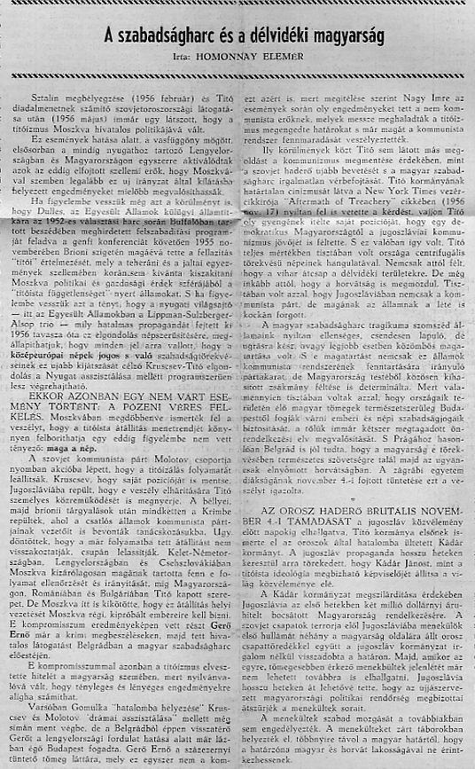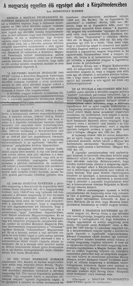 - Homonnay Elemér: A magyarság egyetlen élo egységet alkot a Kárpátmedenceben. = In: Hontalan Magyar Kultúra. 1965.05.09.