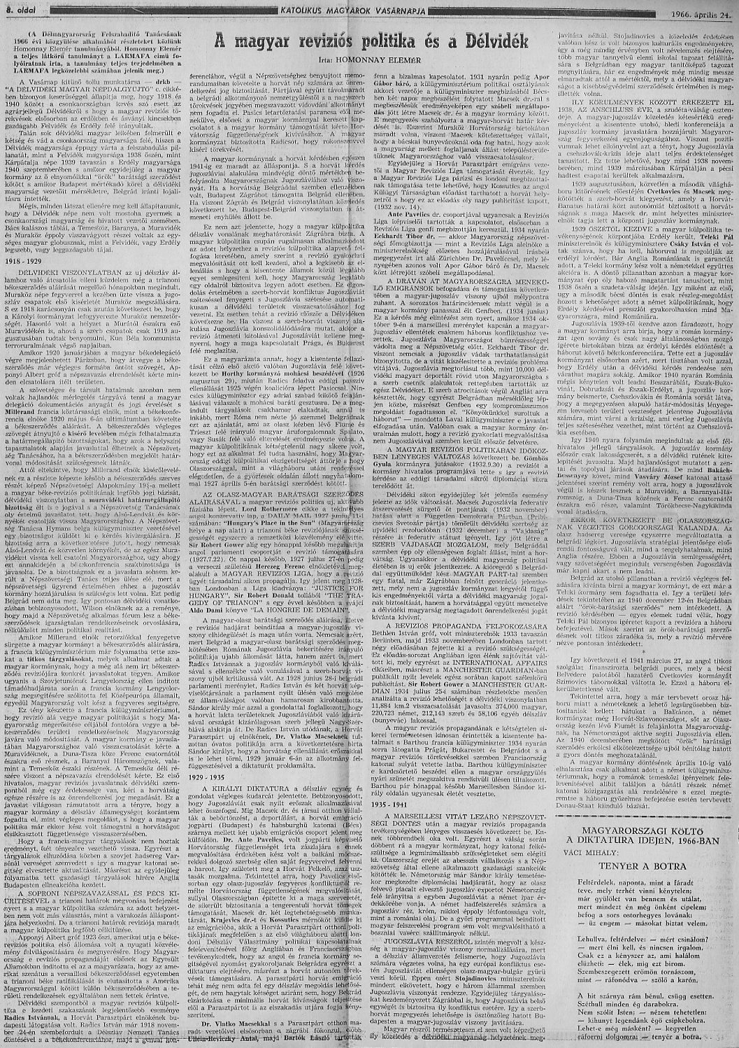 - Homonnay Elemér: A magyar reviziós politika és a délvidék. = In: Katolikus Magyarok Vasárnapja 1966.04.24.