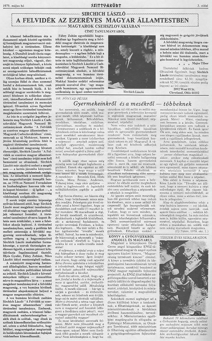 - Sirchich László: A Felvidék az ezredéves magyar államtestben. Magyarok Csehszlovákiában cimu tanulmányból. = In: Szittyakürt 1979. May.