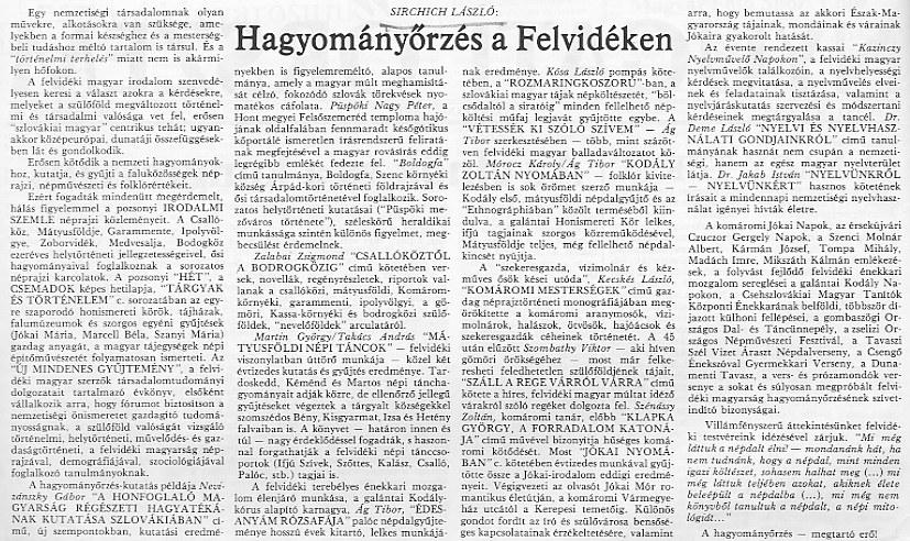 - Sirchich László: Hagyományorzés a Felvidéken = In: Nyugati Orszem 1982. February.
