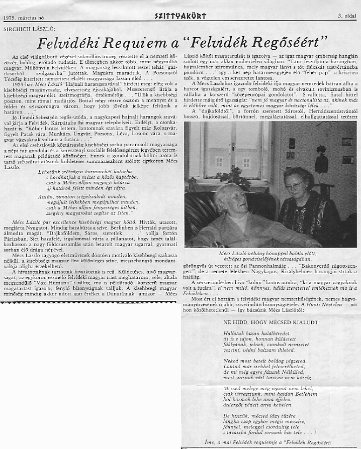 - Sirchich László: Felvidéki Requiem a šFelvidéki Regoséért". = In: Szittyakürt 1979.March.