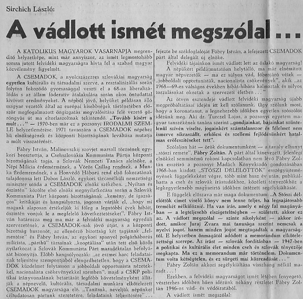 - Sirchich László: A felvidéki magyar muvelodés utolsó két hete. = In: Katolikus Magyarok Vasárnapja 1974.03.17.