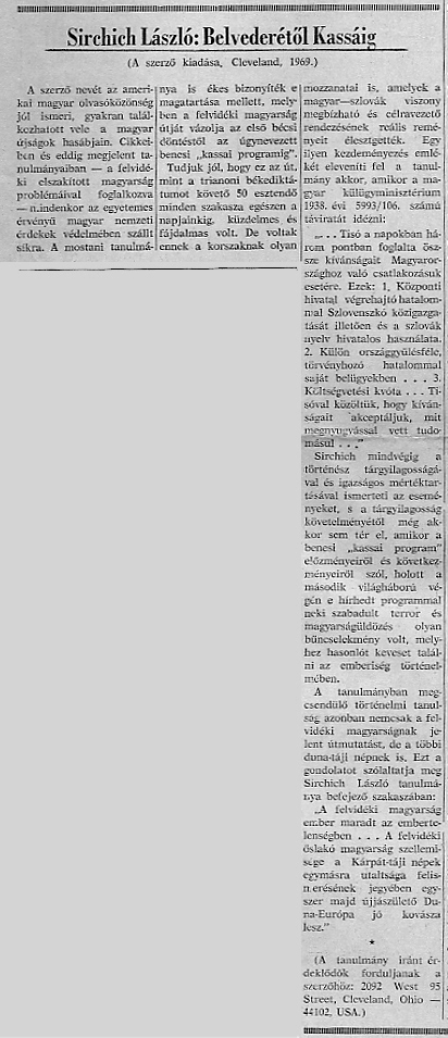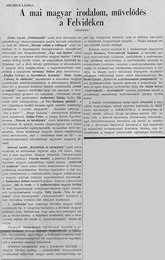 - Sirchich László: A mai magyar irodalom, muvelodés a Felvidéken. = In: Magyar Élet. 1982.02.27.