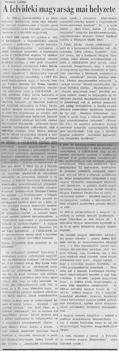 - Sirchich László: a felvidéki magyarság helyzete. = In: Magyar Élet. 1980.02.16.