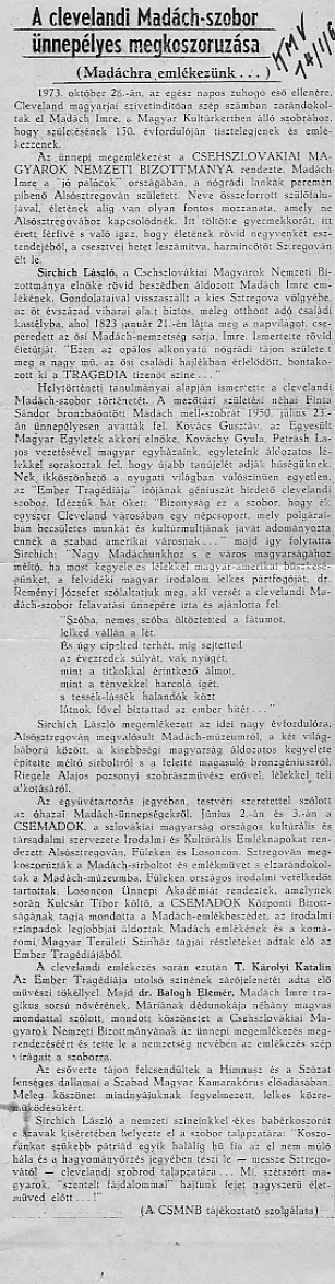 - A clevelandi Madách-szobor ünnepelyes megkoszorúzása. = In: Katolikus Magyarok Vasárnapja 1974.01.06.