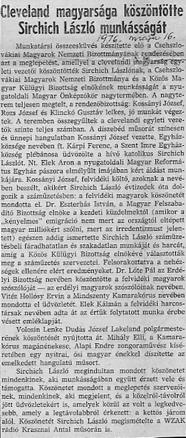 - Cleveland magyarsága köszöntötte Sirchich László munkásságát. = In: Katolikus Magyarok Vasárnapja 1976.05.16.