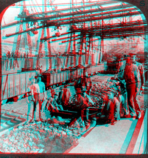 We are looking north, i.e., towards Lake Erie, over the great ore docks along the "Old River Bed" canal. Here immense quantities of iron from the Lake Superior mines are transferred to trains and shipped to the famous blast furnaces and steel-mills at Youngstown, Pittsburgh and elsewhere in the Ohio river valley, 100 to 150 miles away at the southeast. The partially crushed ore in the cars here at our feet and that soft, earth-like ore in the cars beyond have both come up from near the head of Lake Superior where the biggest and richest iron mines in the whole world are being worked. The hoisting apparatus overhead makes quick work of unloading a freighter, for those suspended buckets hold a ton apiece. They are run out over a vessel, let down into the hold, filled, drawn up, slid across the intervening space and then lowered for dumping into a car, all in a space of time hardly more than it takes to tell about it. If the supply of empty cars is insufficient, the accumulating surplus forms great stock-piles like those straight ahead, at our right. Still more rapid work can be done with immense "clams" that clutch five or ten tons at once; the gigantic steel derricks of such an unloading plant loom up in the distance at our left. We can watch at short rang the operation of such powerful machines by using Stereographs 7963 or 7970. For the mining of this ore, use 7947 and 7954. For its later manufacture into steel, use 5520-5523. From Notes of Travel No. 37, copyright by Underwood & Underwood ("Docks at Cleveland, O., with apparatus for unloading iron ore" is written in six languages, including English, French, German and Russian.) -