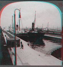 THE LOCKS AT SAULT STE. MARIE, MICHIGAN: We hear a great deal of the Suez Canal and of the Panama Canal, but there is a canal in the United States that handles more traffic than either. The Great Lakes in the United States furnish the most remarkable inland waterway in the world. To make this waterway navigable all the way from Duluth, Minnesota, to Buffalo, New York, it was necessary to do several things. The river connecting Lakes Erie and Huron had to be deepened and the connection between Lake Huron and Superior had to be negotiated in some manner.