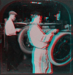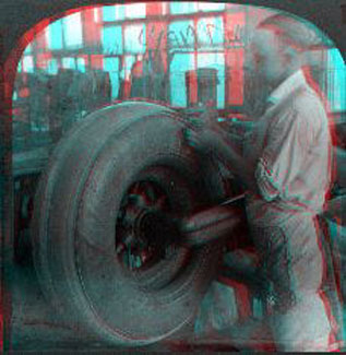 The material that has been used to make up this automobile tire has passed through many machines and has been worked on by many other skilled workmen before it has reached this workman. This man is carefully trimming one of the many layers that make up this large tire. Before this tire is finished, it must be placed in a steel mould of just the right size and tread design. This mould has a metal center part which will keep the inside of the tire hollow and in shape. While in that mould the tire will be heated very hot and at the same time be subjected to great pressure. After that process the tire will go to the inspection room. There it will be thoroughly examined. Those tire that are found to be perfect will be shipped away to be sold. If any are not quite prefect, they will be marked "seconds" and sold at a lower price than the perfect ones.