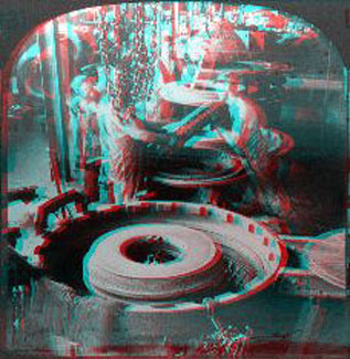 The big plates are then moved to the polishing room. The polishing consists of three processes: grinding, smoothing and polishing. Grinding and smoothing are done almost in the same way. Rotating tables, wheels of iron such as you see are let down on the surface of the glass. Emery, fine sand, or carborundum is sprinkled on the surface. The tables of iron are let down until they fit closely against the surface of the glass and then are set in motion. The fine particles of emery, etc., cut the surface of the glass very smooth.