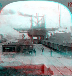 Today the "clam" unloaders are more commonly used. We can see this apparatus looming in the air above that farther pier. By this newer method, five to ten tons of ore can be lifted in one load, and the work can be done much more quickly than by the "pocket" method. -